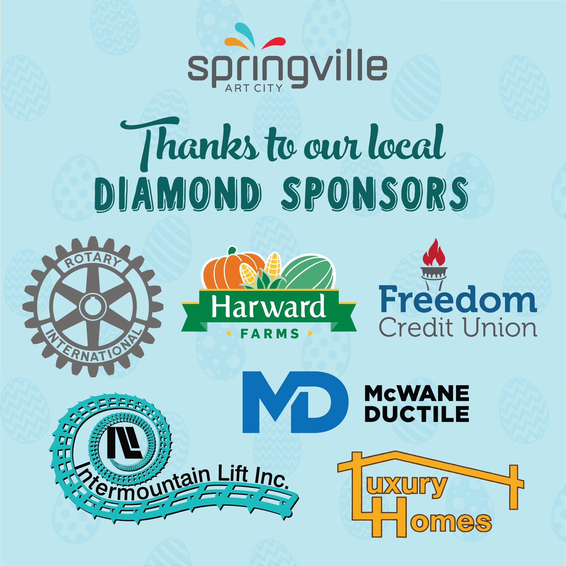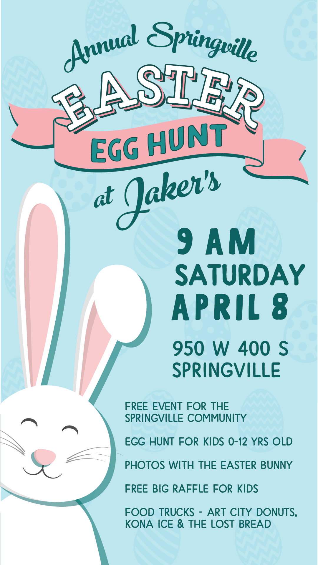Free event for the Springville community. Egg Hunt for kids 0-12 years old, photos with the Easter Bunny, free big raffle for kids, food trucks: Art City donuts, Kona Ice & The Lost Bread.